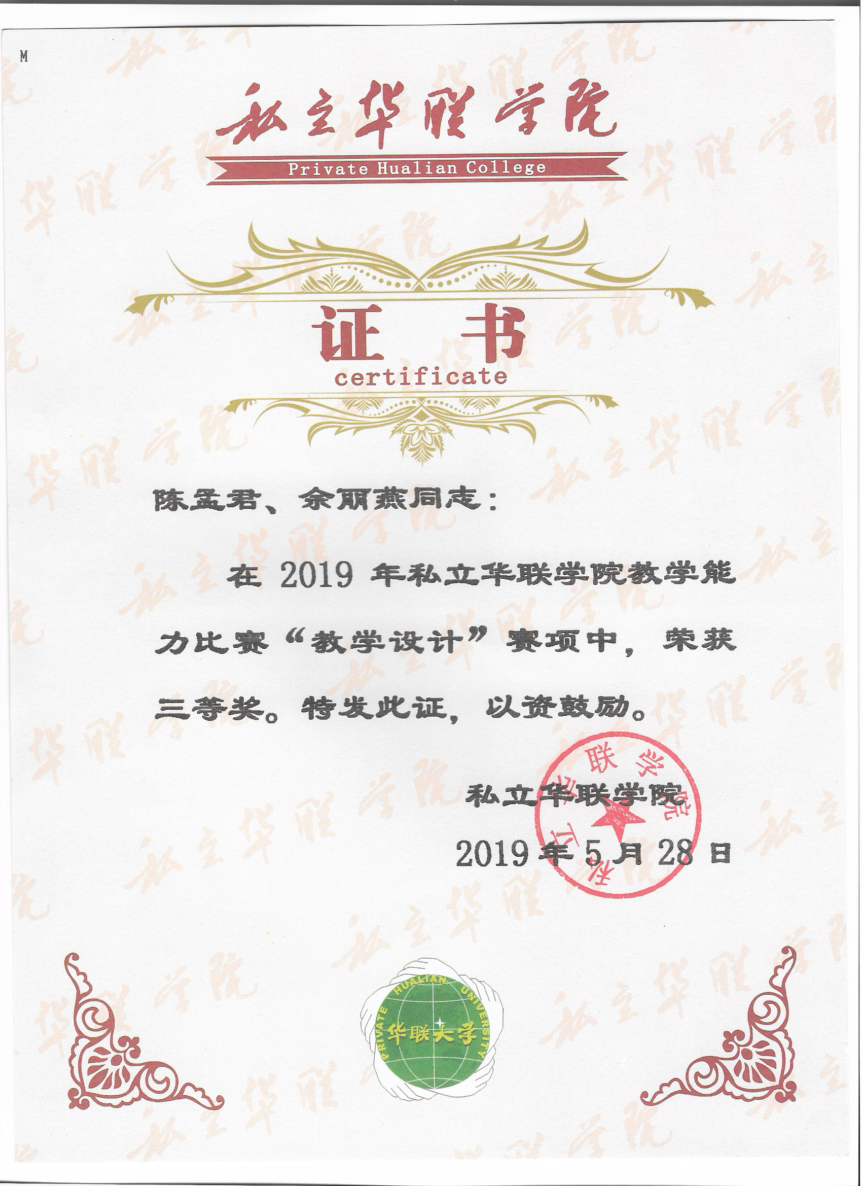 | 1 | 2019年度教学能力大赛“教学设计”赛项 | 2019.5 | 陈孟君 余丽燕 |