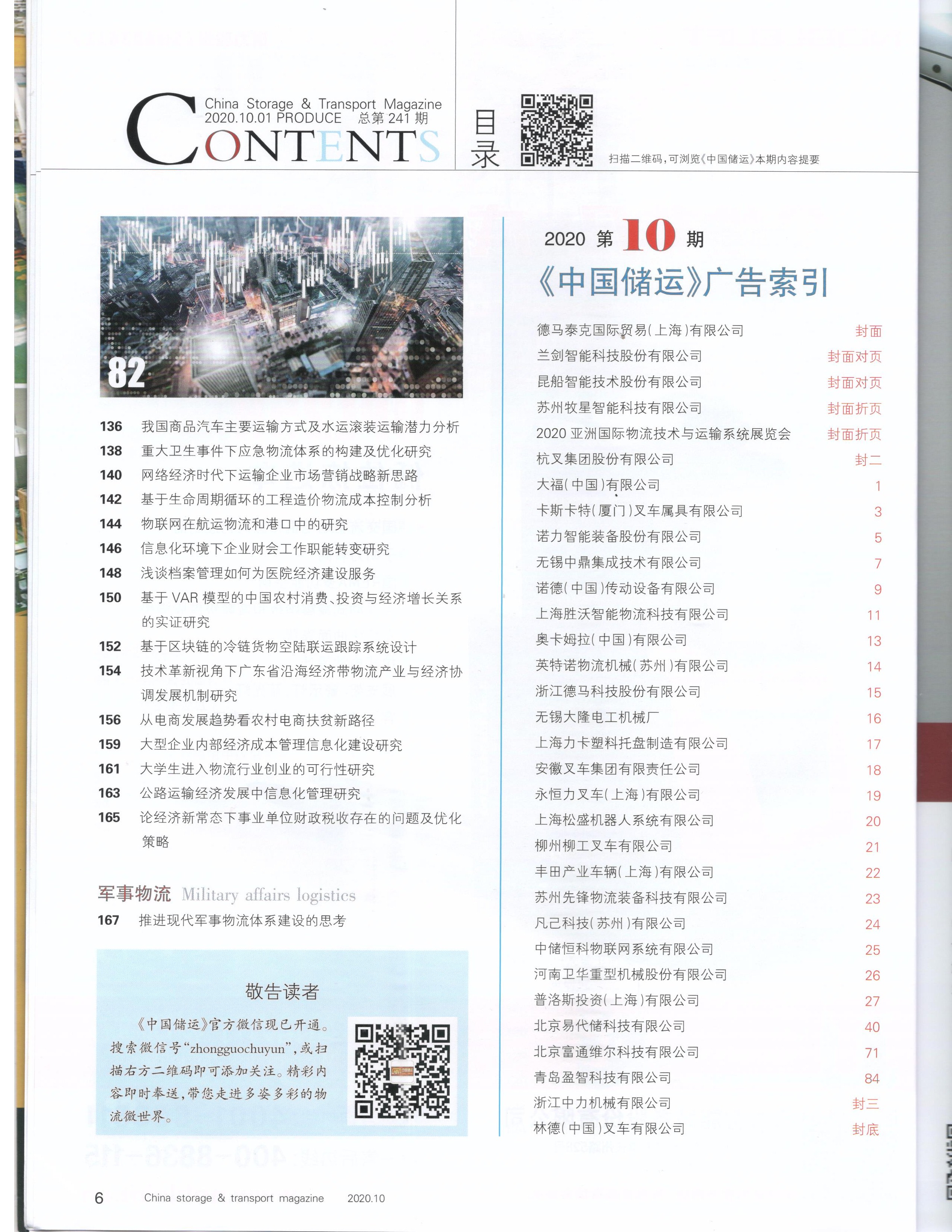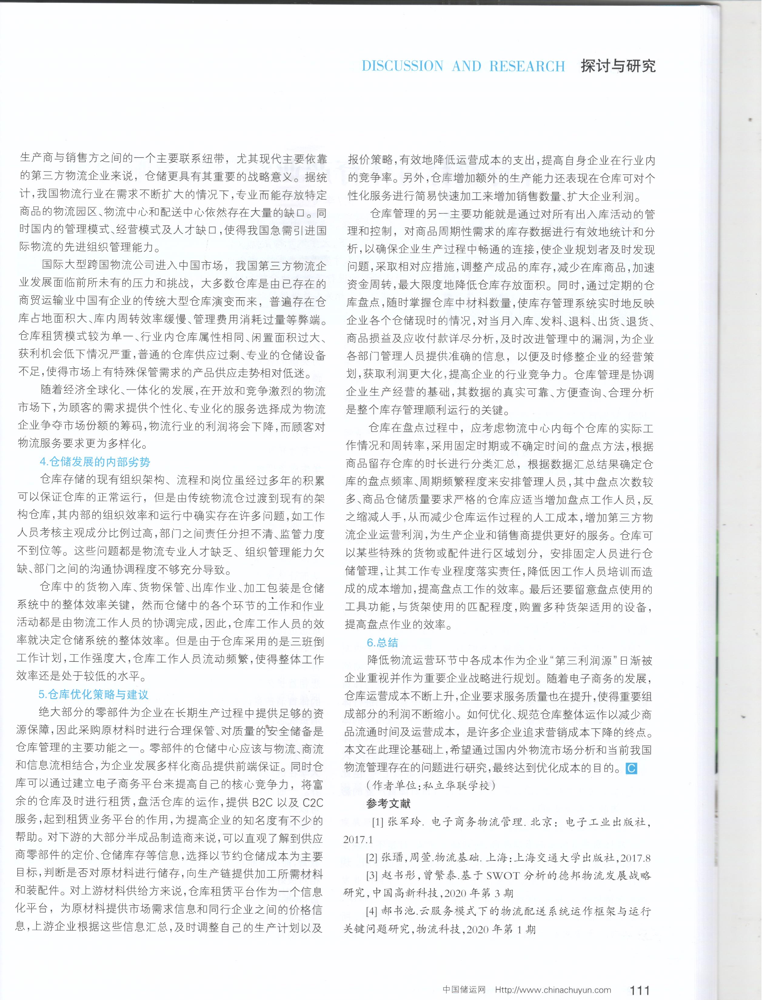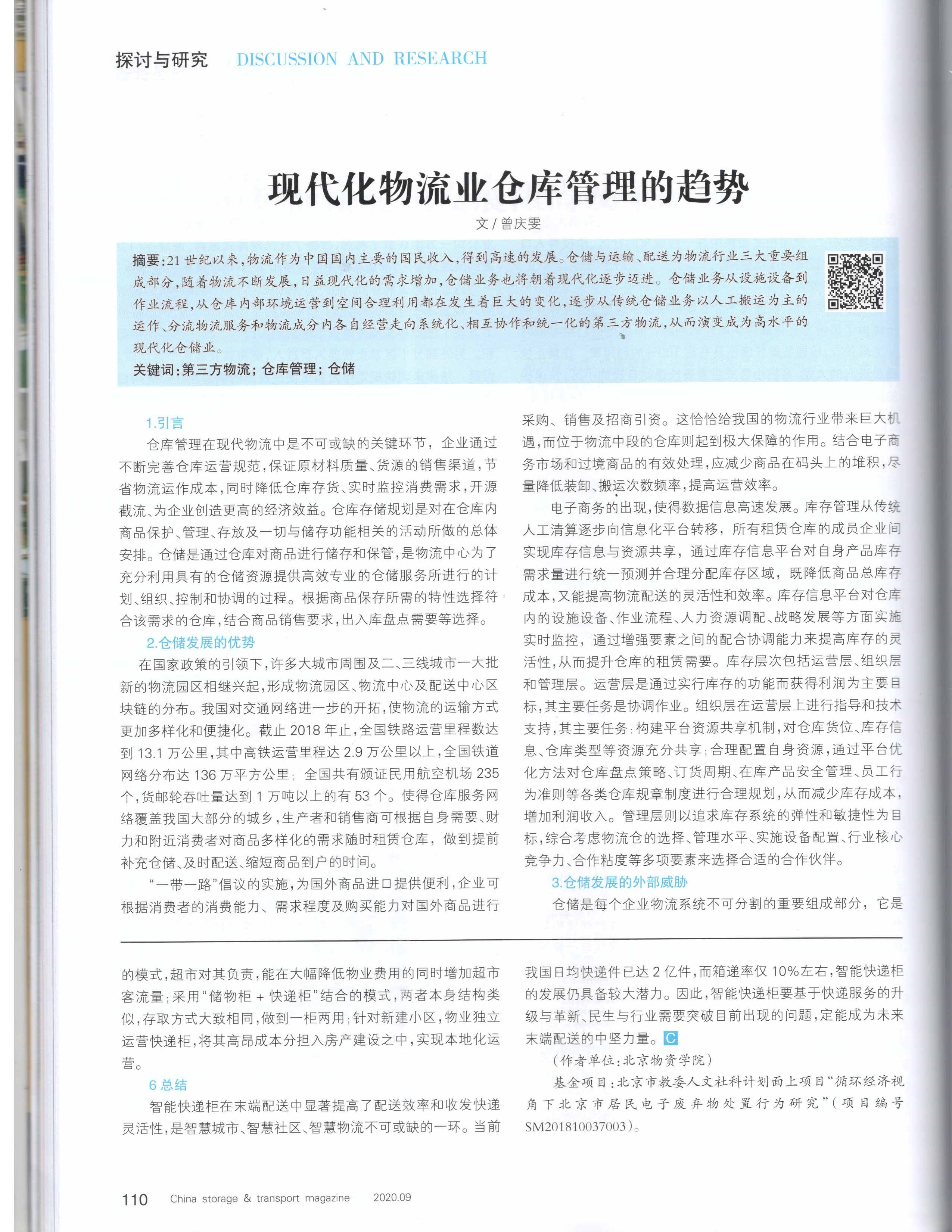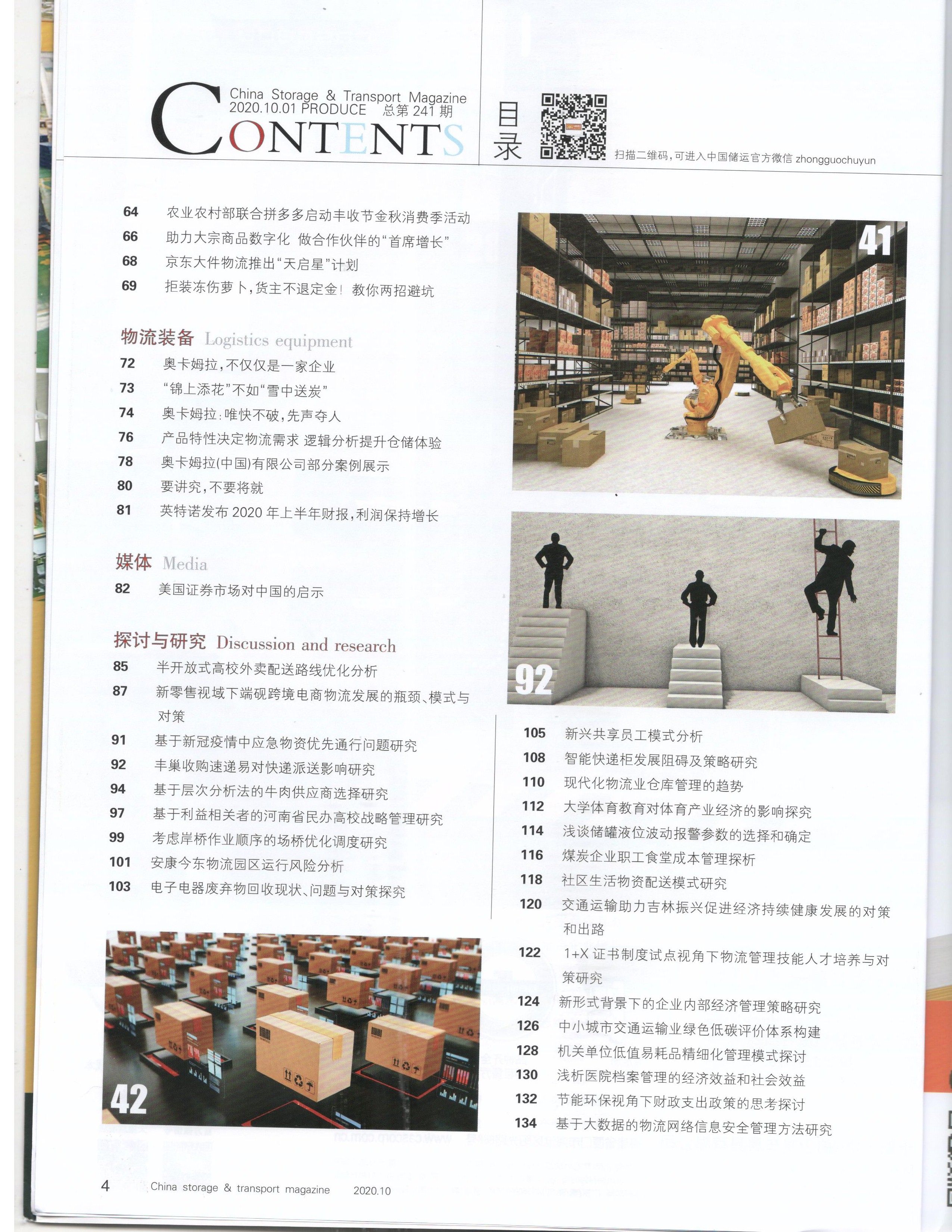 | 4 | 现代物流业仓库管理的趋势 | 曾庆雯 | 2020.10 | 中国储运 ISSN:1005-0434 |